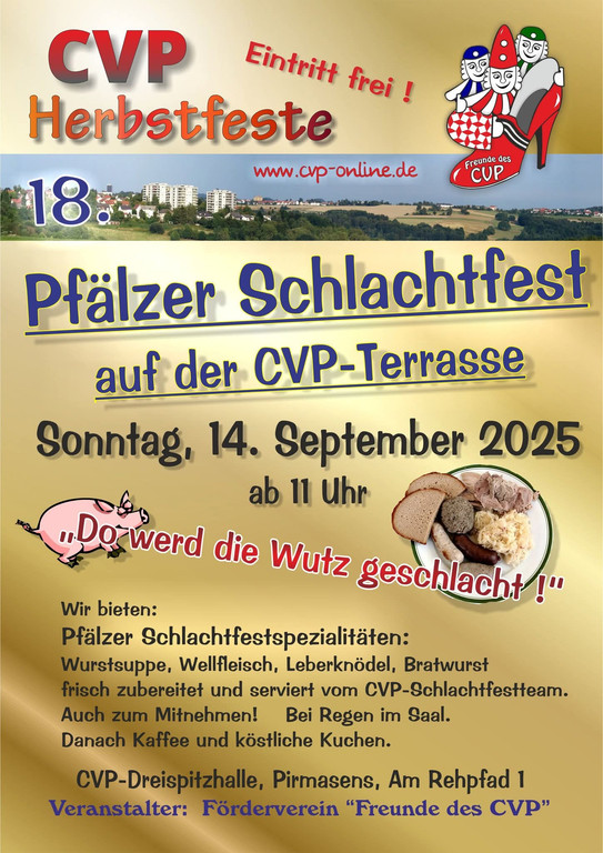 Ab 11 Uhr werden Pfälzer Schlachtfestspezialitäten frisch zubereitet und serviert, darunter Wurstsuppe, Wellfleisch, Leberknödel und Bratwurst. Anschließend gibt es Kaffee und Kuchen. Die Speisen können auch zum Mitnehmen bestellt werden. Für musikalische Begleitung sorgt Patrick „Paddi“ Neumann.