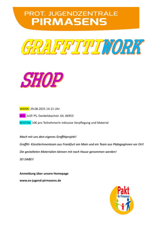 Die Teilnahme kostet 10 Euro pro Person, inklusive ist das Material, die Betreuung und Vollverpflegung. Der Workshop findet in der Jugendzentrale Pirmasens (Dankelsbachstraße 64) statt.