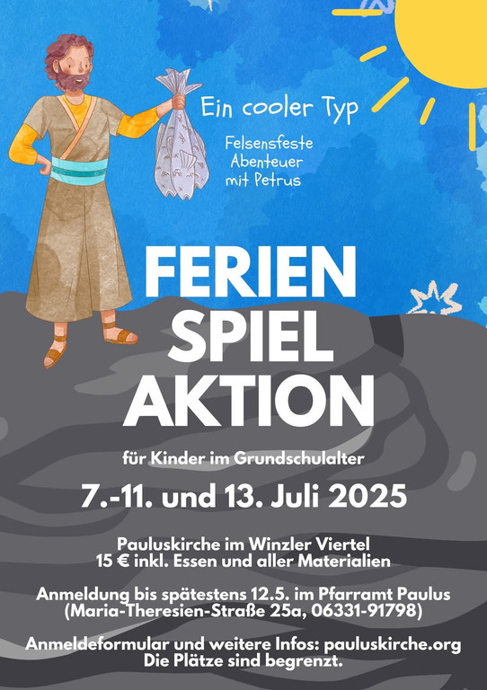 3edd3270-504c-4d74-903f-285117f3740eMitmachen können Kinder im Grundschulalter. Die Teilnahme kostet 15 Euro pro Kind, darin sind ein Mittagessen pro Tag und sämtliche Materialien enthalten. Das Anmeldeformular muss bis spätestens 12. Mai 2025 im Prot. Pfarramt West (Maria-Theresien-Straße 25a) abgegeben oder per Mail an pfarramt.ps.west1@evkirchepfalz.de.