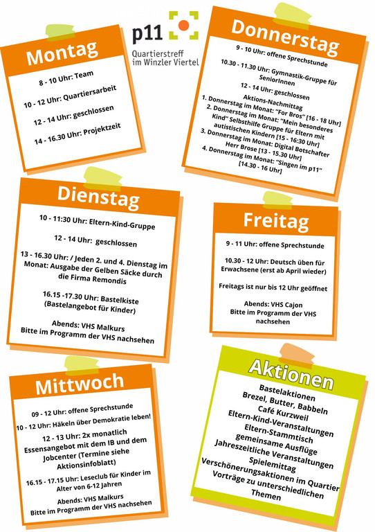 Das p11 befindet sich im Herzen des Winzler Viertels (Adresse: Patio 11). In dem Begegnungszentrum ist Raum für alle Menschen jeder Altersgruppe, hier treffen sich verschiedene Gruppen, Kreise, außerdem gibt es offene Sprechstunden.